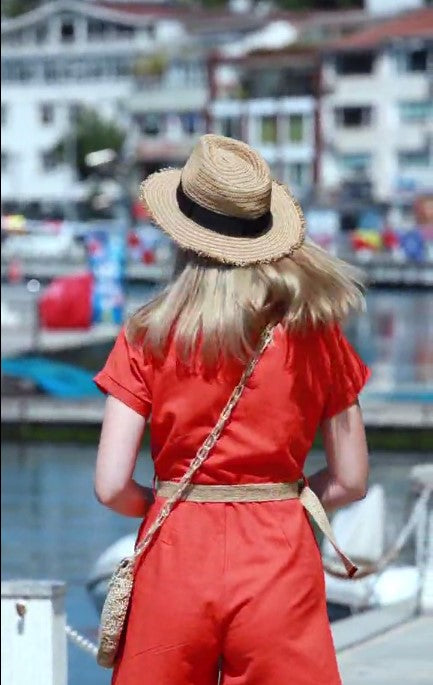 SKU:1147 This trendy women's jumpsuit features a notched collar, short straight sleeves, and a wide-bottom fit for comfort. Made from lightweight keten linen, it is perfect for casual summer wear. Available in orange and black, it closes with buttons and offers a relaxed, stylish look. Made in Turkey.
